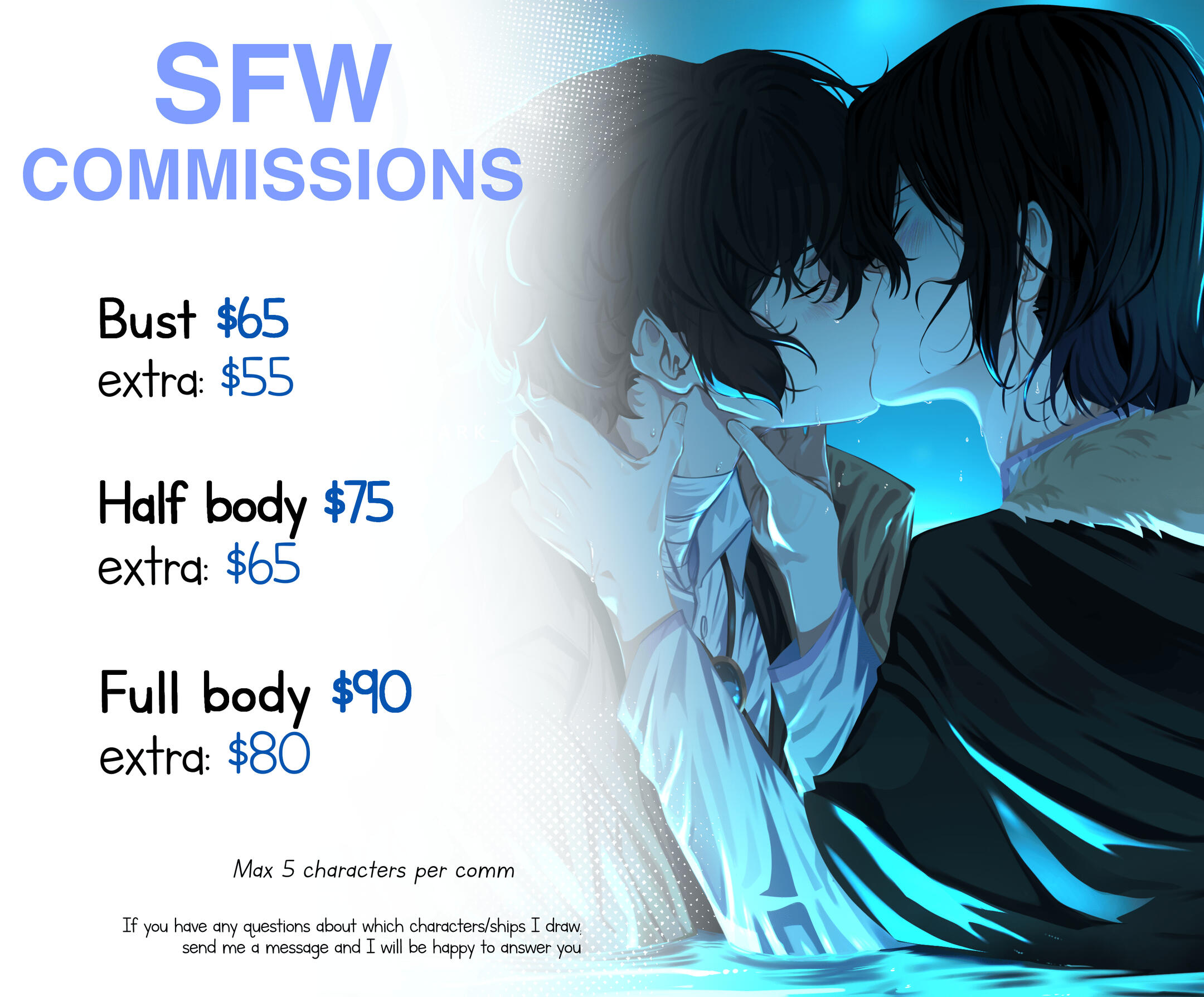 + Type of commission (bust, half body, NSFW...).